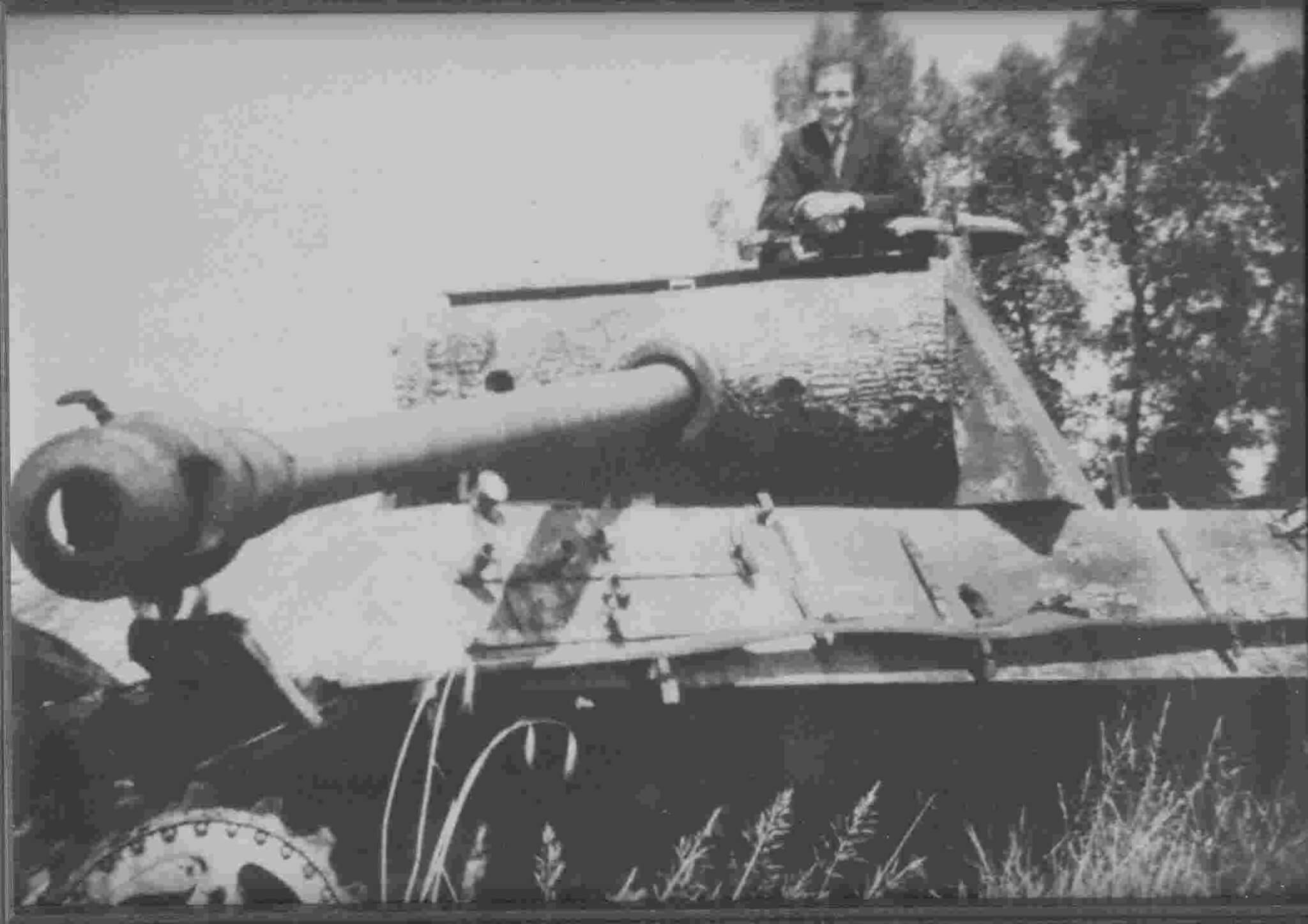 Een Duitse tank op de Scheerdonk met rechts het gat van de inslag en boven zit Piet Coolen triomfantelijke op de uitkijk