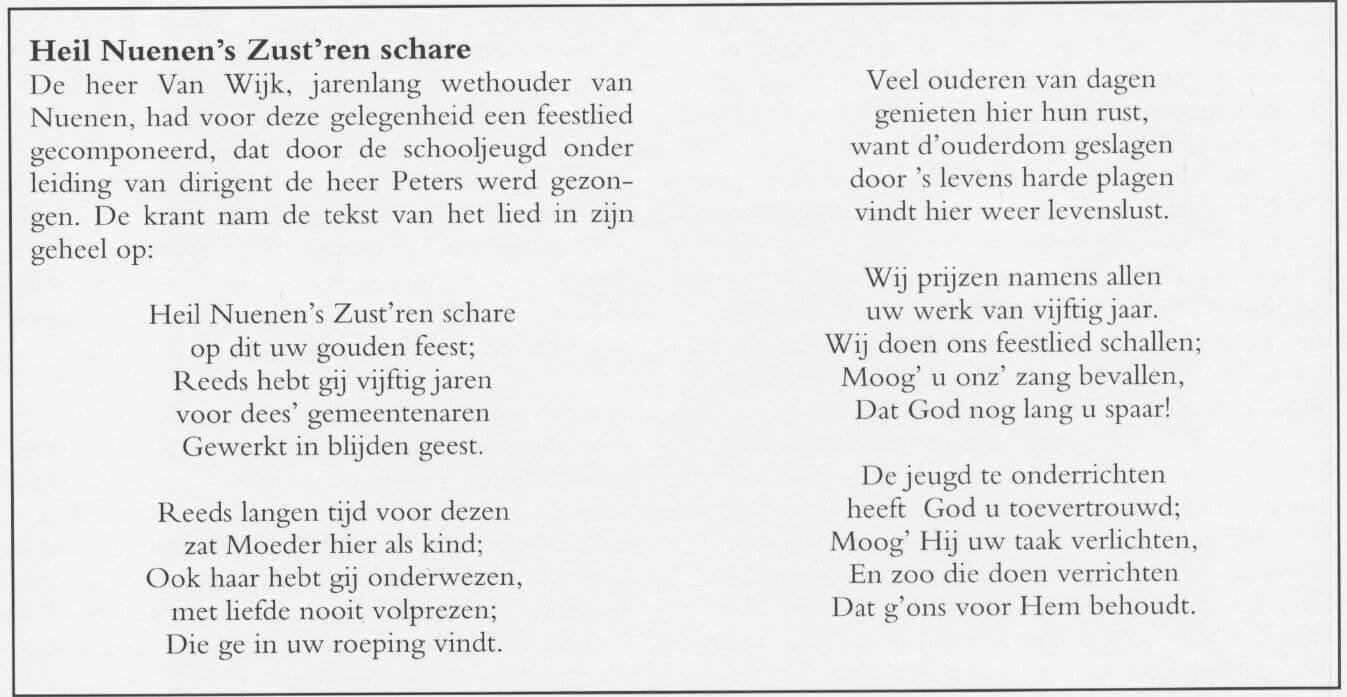 "Het was gister feest in Nuenen! Vroolijk wapperden de vlaggen van huis tot huis, terwijl vooral in de omgeving van "Het Park" een prachtige maar niettemin stemmige versiering uiting gaf aan de vreugde van het geheele dorp. Zelfs de zon werkte door haar heldere stralen mee om alles een nog luisterrijker cachet te geven. De Zusterkens herdachten gisteren hun 50-jarig vestigingsfeest. Meer dan ooit besefte de Nuenense bevolking de rijke zegeningen, die door deze vrome en opofferende zusters gebracht zijn in de loop van vijftig lange jaren. En juist omdat deze zegeningen geschonken werden, zonder het uitkramen en uitschetteren van eigen verdiensten maar over de bevolking nederdaalden in stille onderworpenheid aan schoone kloosterregels, wilde de Nuenensche gemeenschap, hiertoe bij het 50-jarig vestigingsfeest in staat gesteld, zoo gaarne van haar groote dankbaarheid blijk geven."