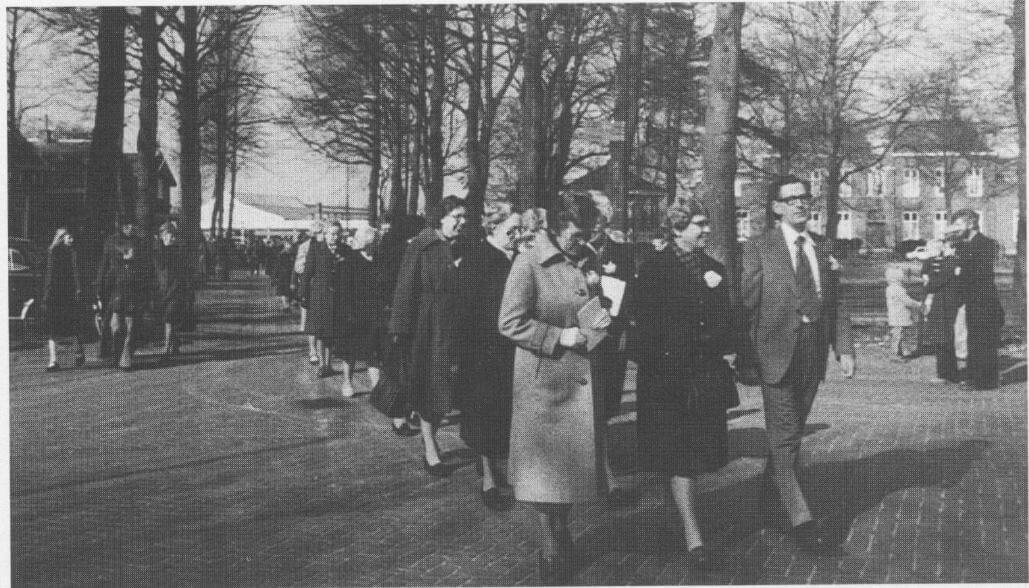 Op weg naar de Clemenskerk, 27 februari 1977. Voorop de voorzitter van het feestcomité de heer Hölscher, met zuster Agnes, zuster Marie-José en zuster Joseph.