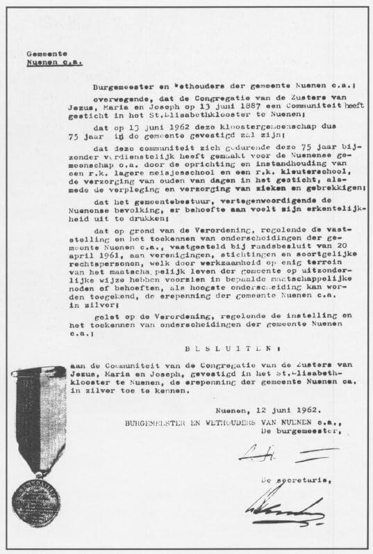 Daarna nam burgemeester Haffmans het woord. In "Rond de linde" van 21 juni 1962 vonden we daarvan het volgende verslag: "De burgemeester ging de geschiedenis der zusters, vanaf de stichting der orde, na en sprak woorden van waardering en dank voor alle goede zorgen, die de zusters van J.M.J. aan de Nuenense gemeenschap besteed hadden. Namens het dagelijks bestuur der gemeente kon hij de verblijdende mededeling doen, dat B. en W. de gezamenlijke Nuenense zustergemeenschap de hoogste gemeentelijke onderscheiding, die een gemeenschap kan worden toegekend, de erepenning zilver, had verleend." Onder applaus verzocht de burgemeester een der zusters de eerwaarde moeder-overste de versierselen op te spelden.