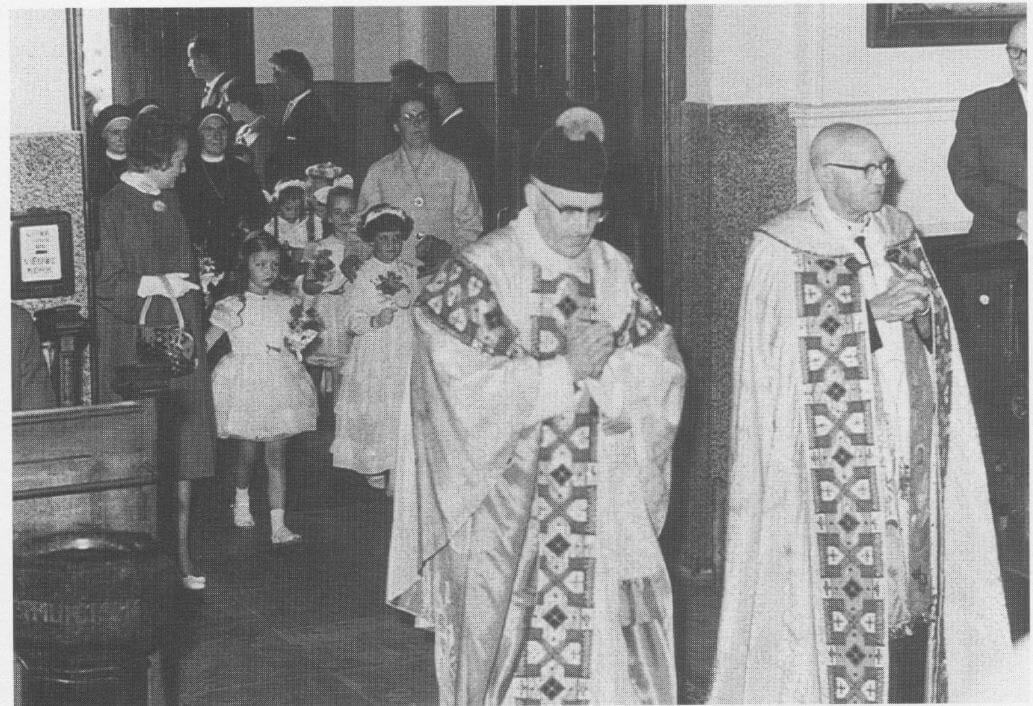 Mgr. Oomens en pastoor Aldenhuysen bij het binnenkomen van de Clcmenskerk. Bij de bruidjes Jo Goudsmits, onderwijzeres aan de H. Hartschool