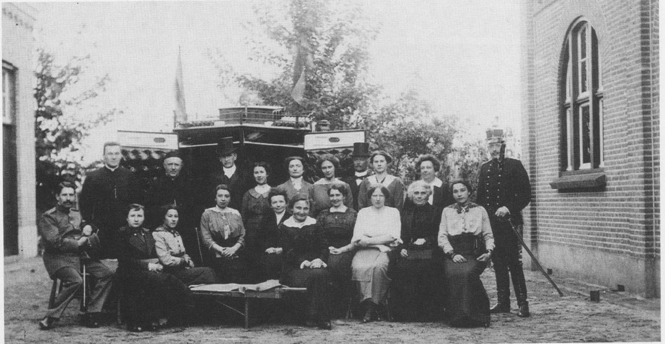 Het Nuenense Rode Kruis-Comité in 1914, gefotografeerd tussen de pastorie (links) en het oude patronaatsgebouw. Voorzitster van het comité was mevr. Raupp, de echtgenote van de gemeentearts. Staande linksachter: kapelaan Van der Heijden en pastoor Jac. van der Vleuten. Op de eerste rij zitten, van links naar rechts de dames Van de Kemenade, M. van der Ven, Rooyakkers, onbekend, J. Prinsen, Raupp, Tempelman, De Kruijff, T. van der Ven.