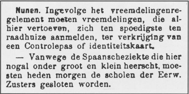 Tussen 1917 en 1919 eiste een beruchte griepepidemie over de hele wereld miljoenen doden. Ook in Nuenen heerste deze Spaanse ziekte, getuige een persbericht in de Meierijsche Courant van 22 oktober 1918:
