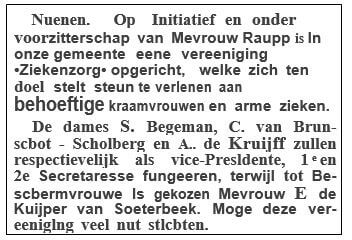 Op particulier initiatief werd op 16 maart 1909 de vereniging "Ziekenzorg" opgericht, met als doel het verlenen van steun aan behoeftige kraamvrouwen en arme zieken. Het stichtingsbestuur bestond uit de dames Raupp, S. Begeman, C. van Brunschot-Scholberg en A. de Kruijff. Als beschermvrouwe trad op mevr. E. de Kuijper van Soeterbeek.