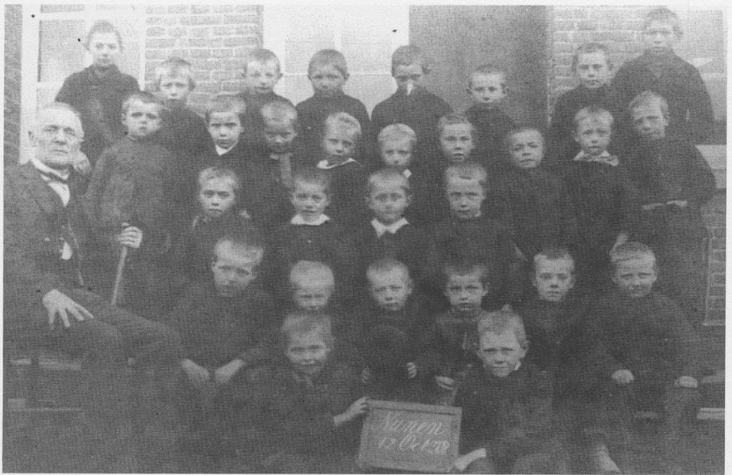 Meester J.A.M.C. (Corné) van Brnnschot met zijn klas in 1899. Hij was de zoon van de vorige hoofdonder wijzer W.J. van Brunschot; hij was hulponderwijzer van 1889 tot 1897 (bij zijn vader) en daarna hoofdonderwijzer van 1897 tot 1913.