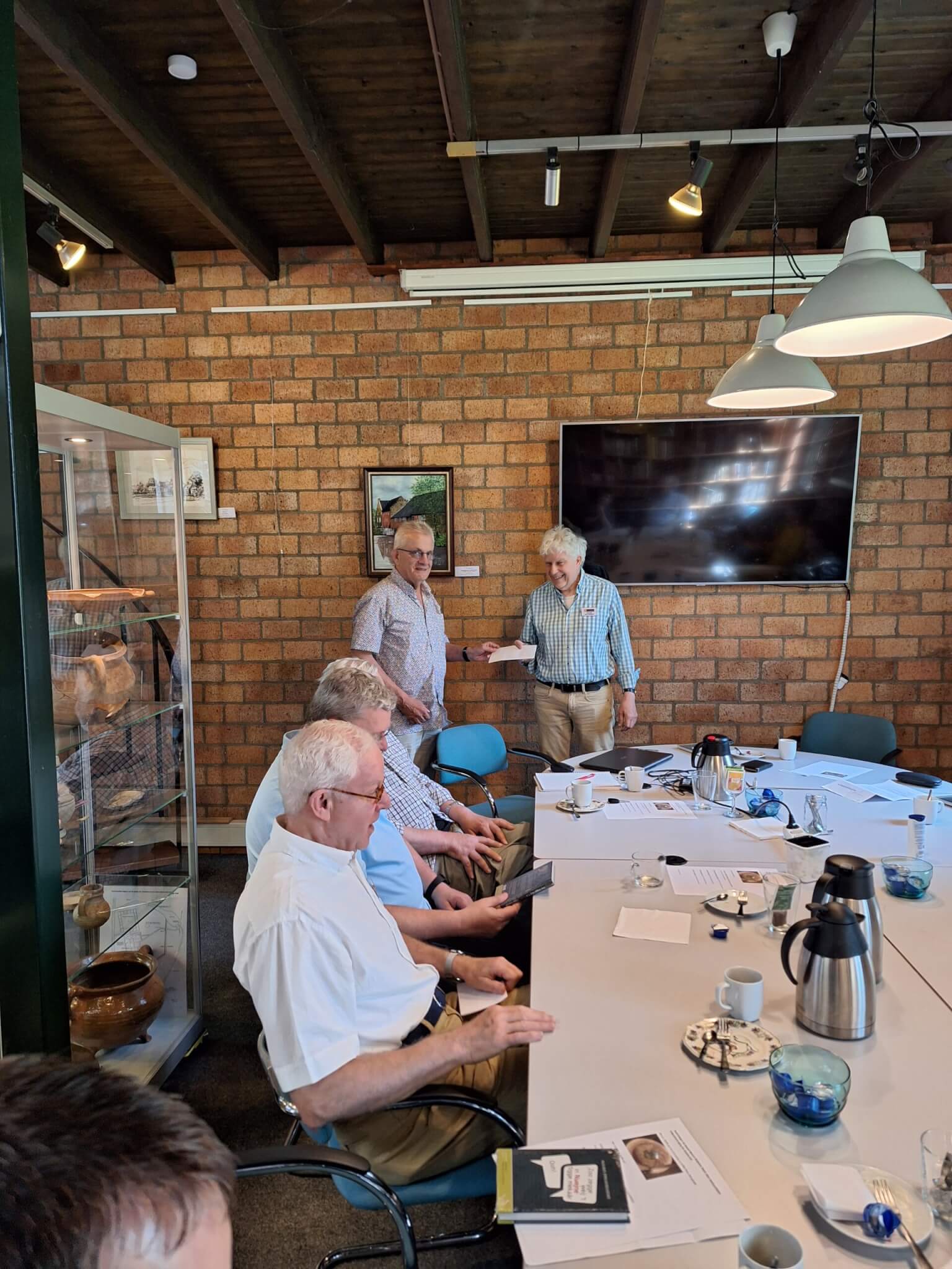 Tjeu van Ras, bestuurslid Brabants Heem, bedankt Roland van Pareren voor de ontvangst bij de Erfgoedvereniging en overhandigt hem een enveloppe met inhoud