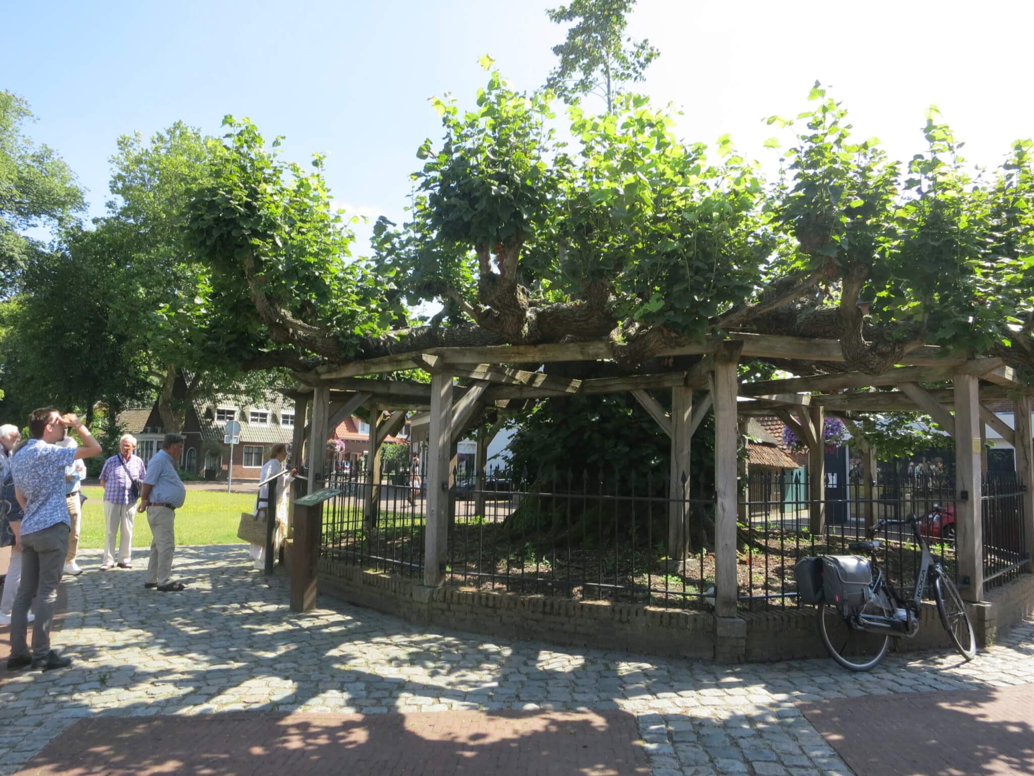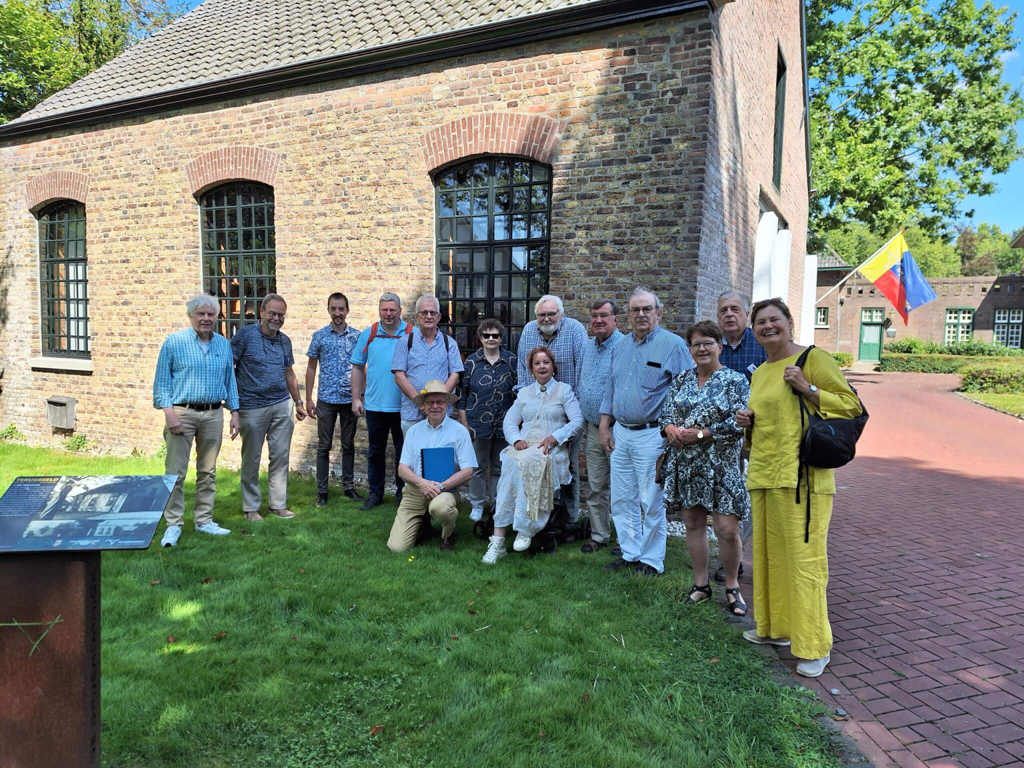 Na een verblijf van bijna twee uur wordt nog een groepsfoto gemaakt bij het Heemhuis, met een Terugbeeldstandaard op de voorgrond en de vlag van de Erfgoedvereniging op de achtergrond