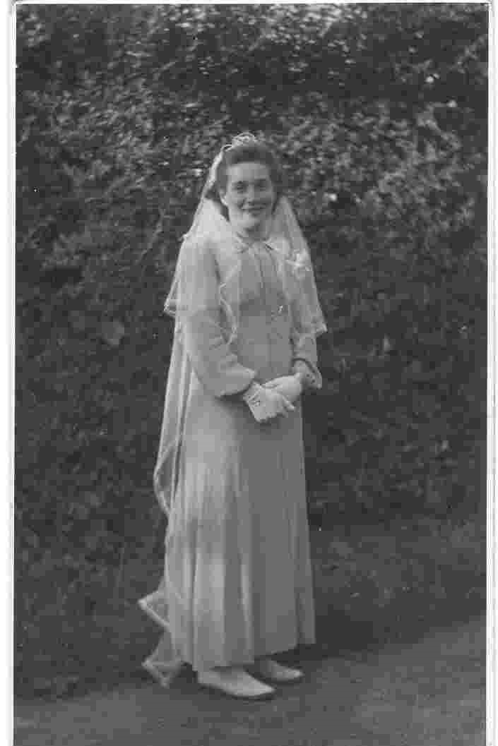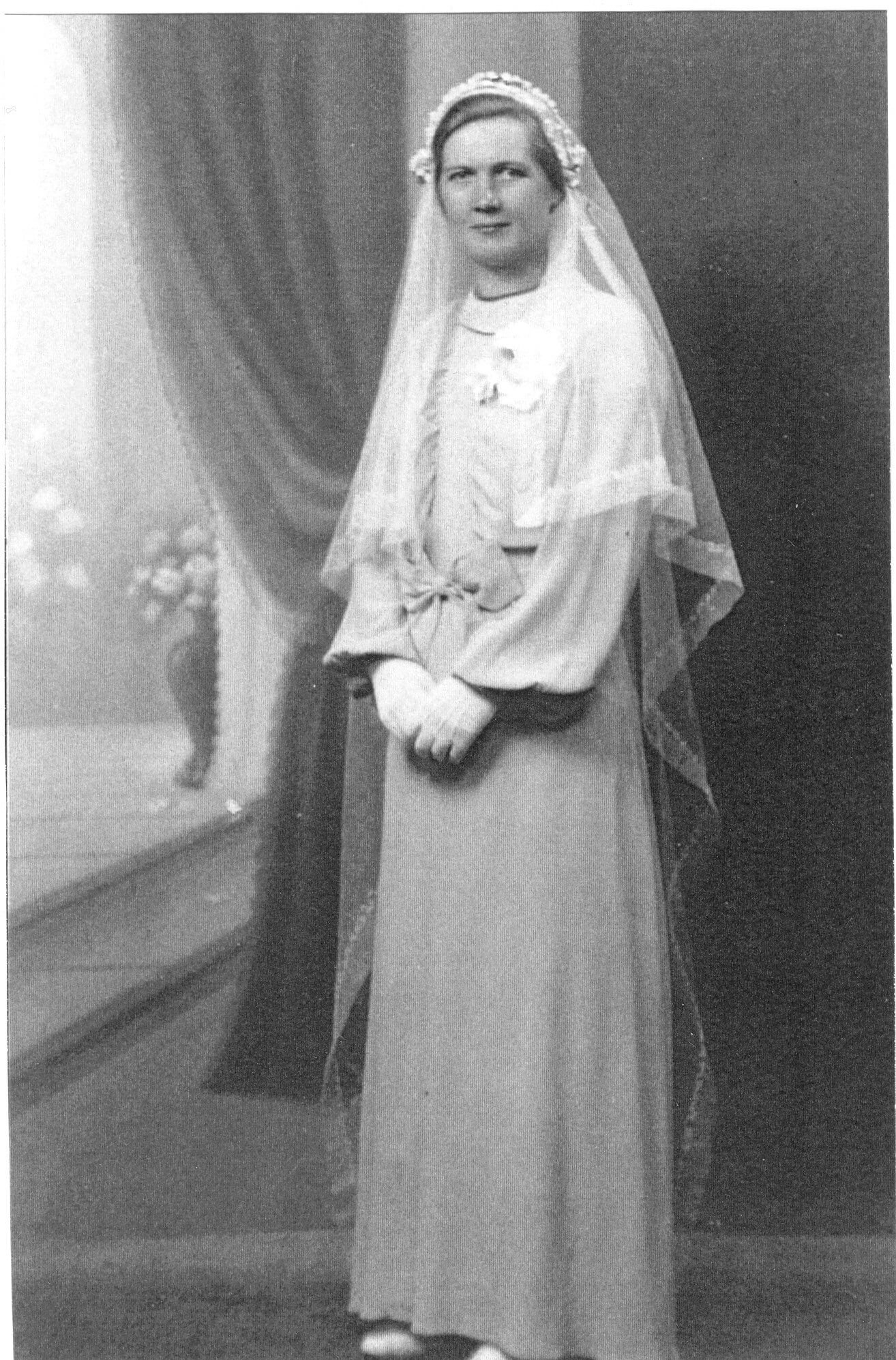 Laura Sleegers in 1944 als Maria bruid met sluier, destijds onder pastoor W.J.H. Roelofs