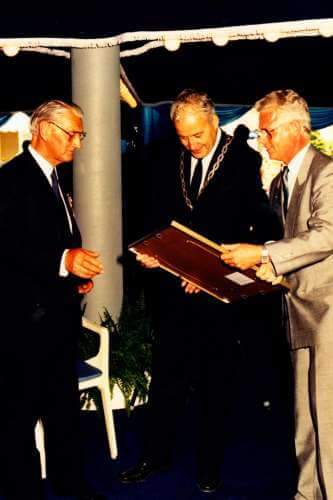 Bij gelegenheid van het afscheid in 1989 van J.C. Nolte bij NOLTE BV, krijgt Koos Nolte de koninklijke onderscheiding Officier in de Orde van Oranje Nassau uitgereikt. v.l.n.r.: Koos Nolte, burgemeester Harry Terwisse en Rens Kuijten.