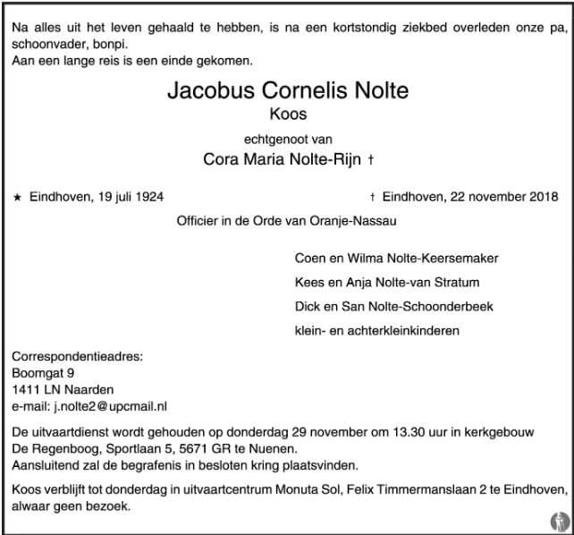 Overlijdensbericht Koos Nolte in 2018