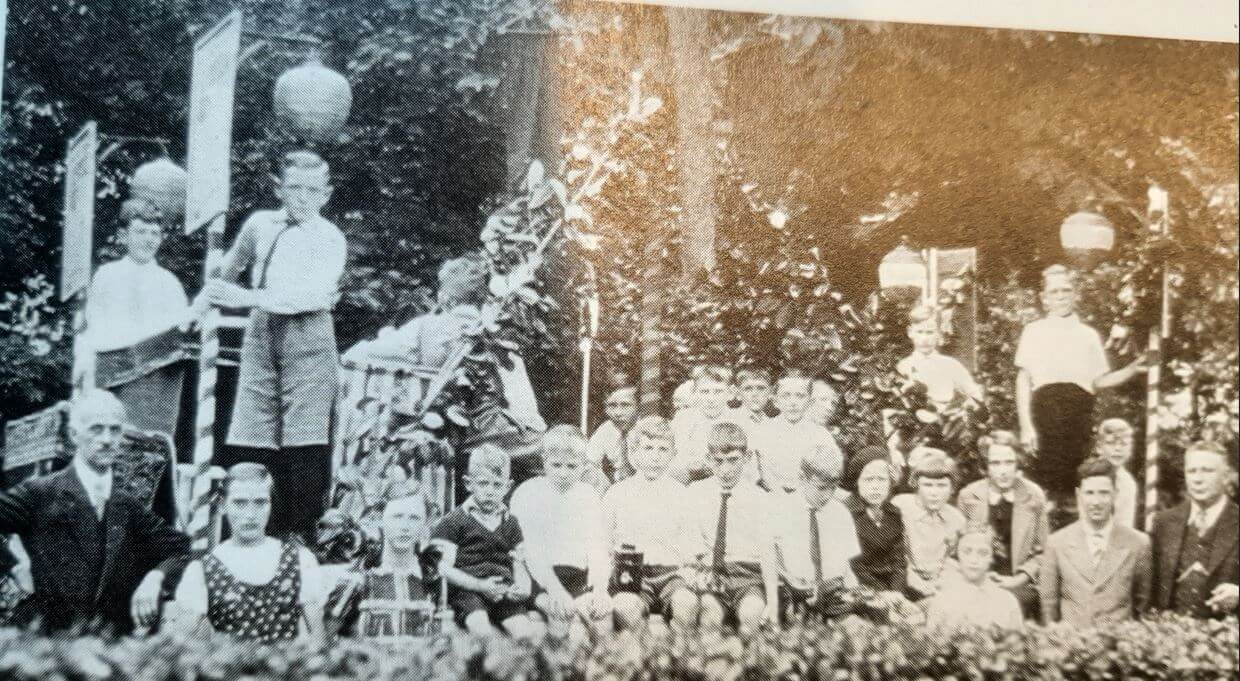 'Crisiscomité' De kinderen trokken erop uit om te collecteren voor het “crisiscomité”. Met paard en wagen, compleet met luidsprekers trokken ze door het dorp. Koos Nolte is de vierde van links, vader Nolte staat uiterst rechts. In het “crisiscomité” zaten Grard Peters, Noud de Rooij, vader Nolte en meester Linders.