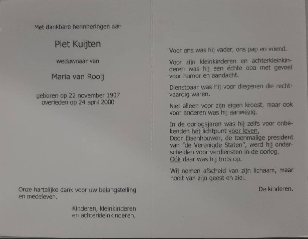 Hieronder treft u het bidprentje aan van Piet Kuijten, die in 2000 is overleden, 6 jaar na het verschijnen van het boek.