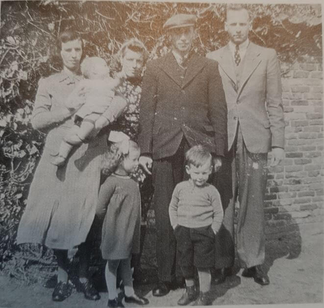Tijdens de oorlogstijd maakte Schreinemachers, die werkte bij het verzet in Eindhoven, deze foto met een zelfontspanner. Vlnr: Marie Kuijten met Maria op de arm, het dienstmeisje Nel Martens, Piet Kuijten en Schreinemachers. Op de voorgrond de kinderen Tonnie en Leo Kuijten.