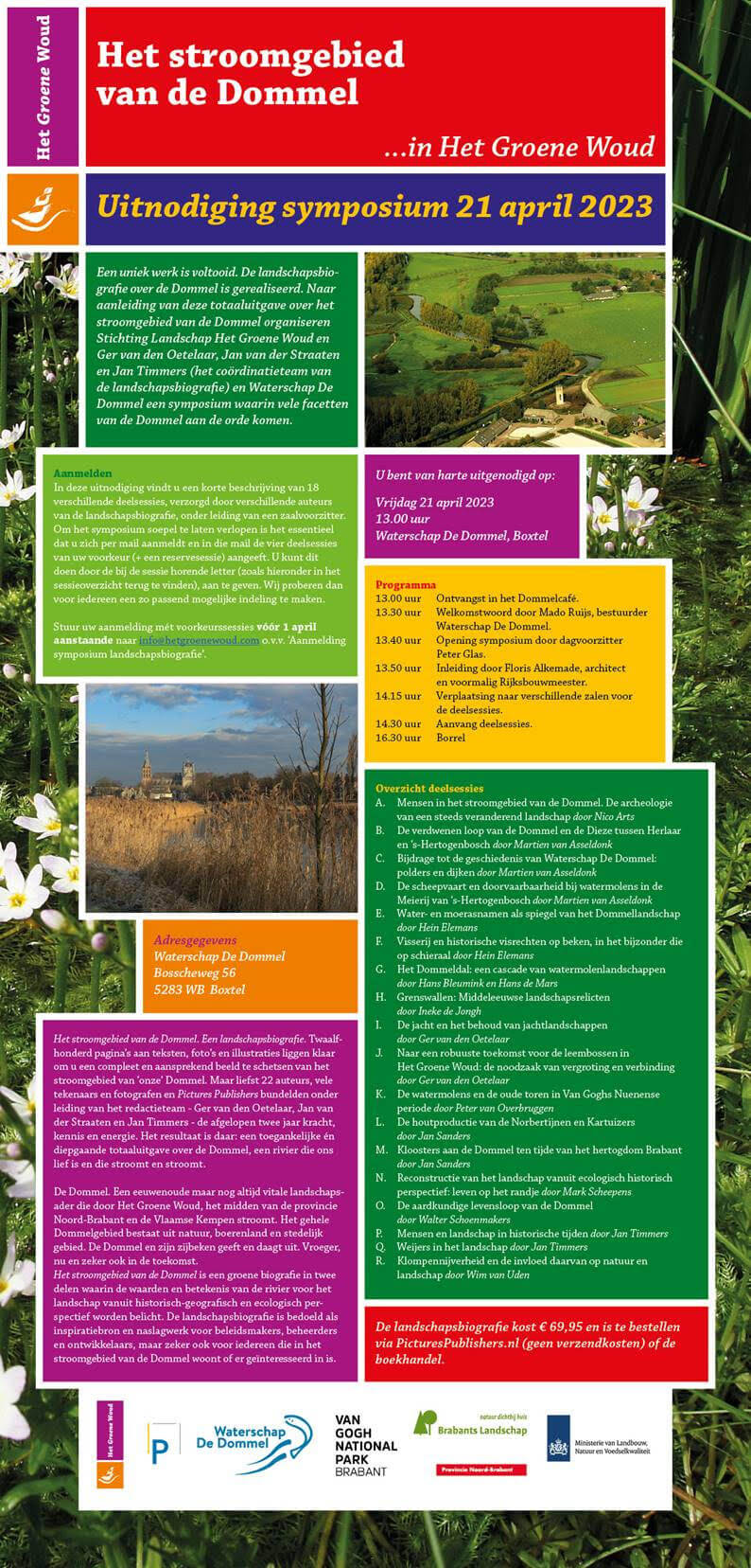 Op 21 april wordt in Boxtel door Stichting Landschap Het Groene Woud een tweedelig boek gepresenteerd over het stroomgebied van de Dommel: Landschapsbiografie van de Dommel. In dat kader vindt op 21 april ook een symposium plaats, waarvoor men ook (vóór 1 april) kan intekenen voor korte presentaties (zie onder). Een aantal van de 20 auteurs zal een kort verhaal vertellen over hun bijdrage in het boek. Peter van Overbruggen en Ton de Brouwer schreven samen een hoofdstuk over De watermolens en de oude toren in Van Goghs Nuenense periode. Peter geeft daar ’s middags ook een presentatie over. Het symposium is vrij toegankelijk.