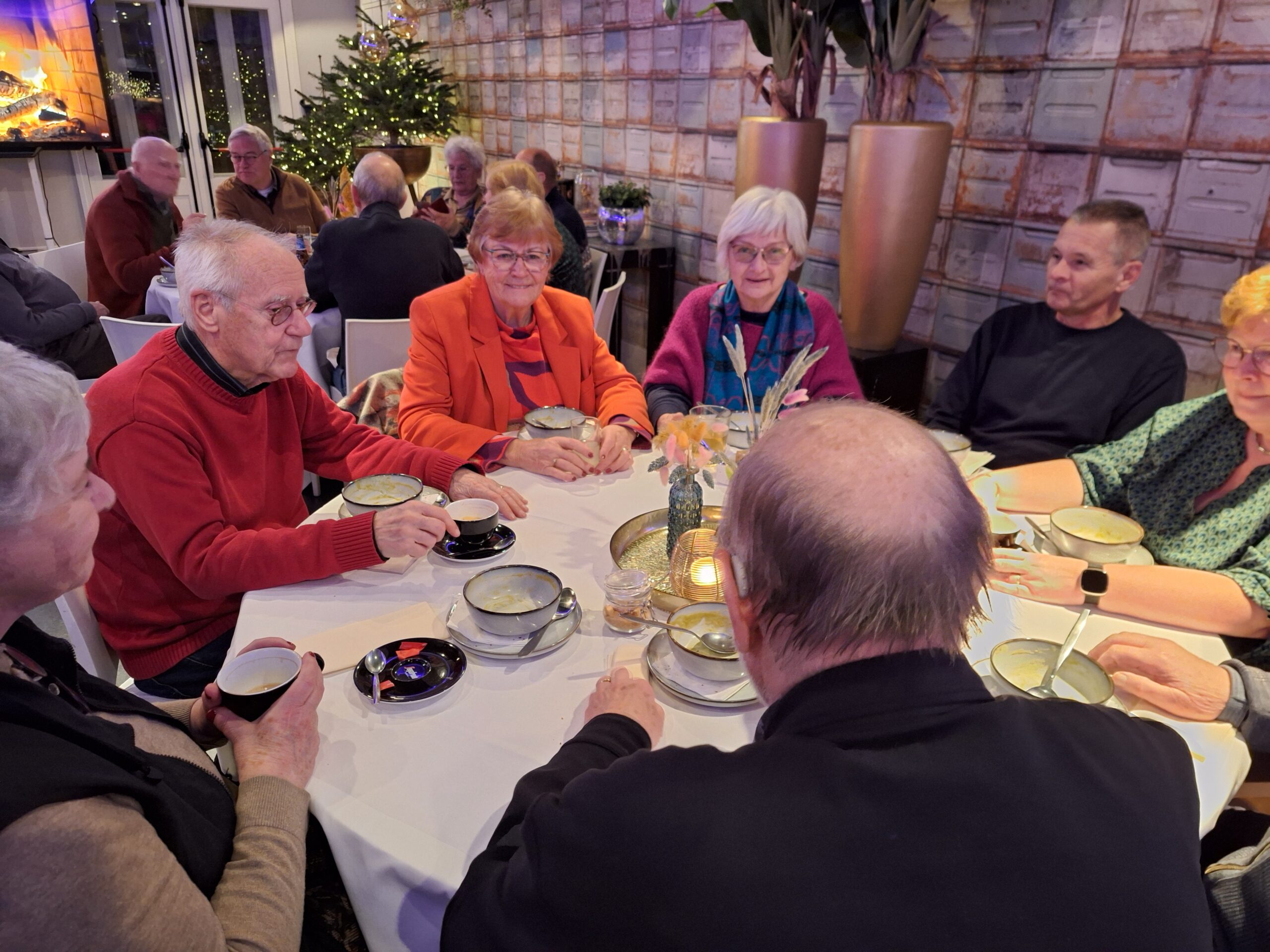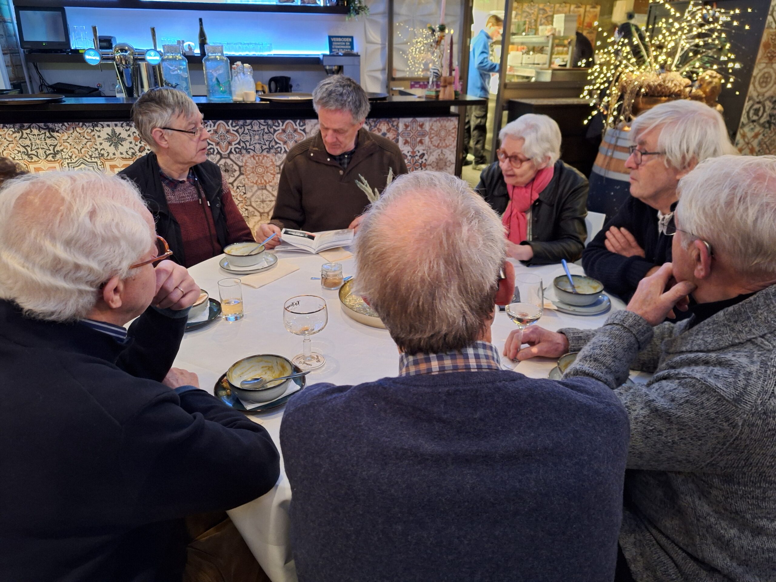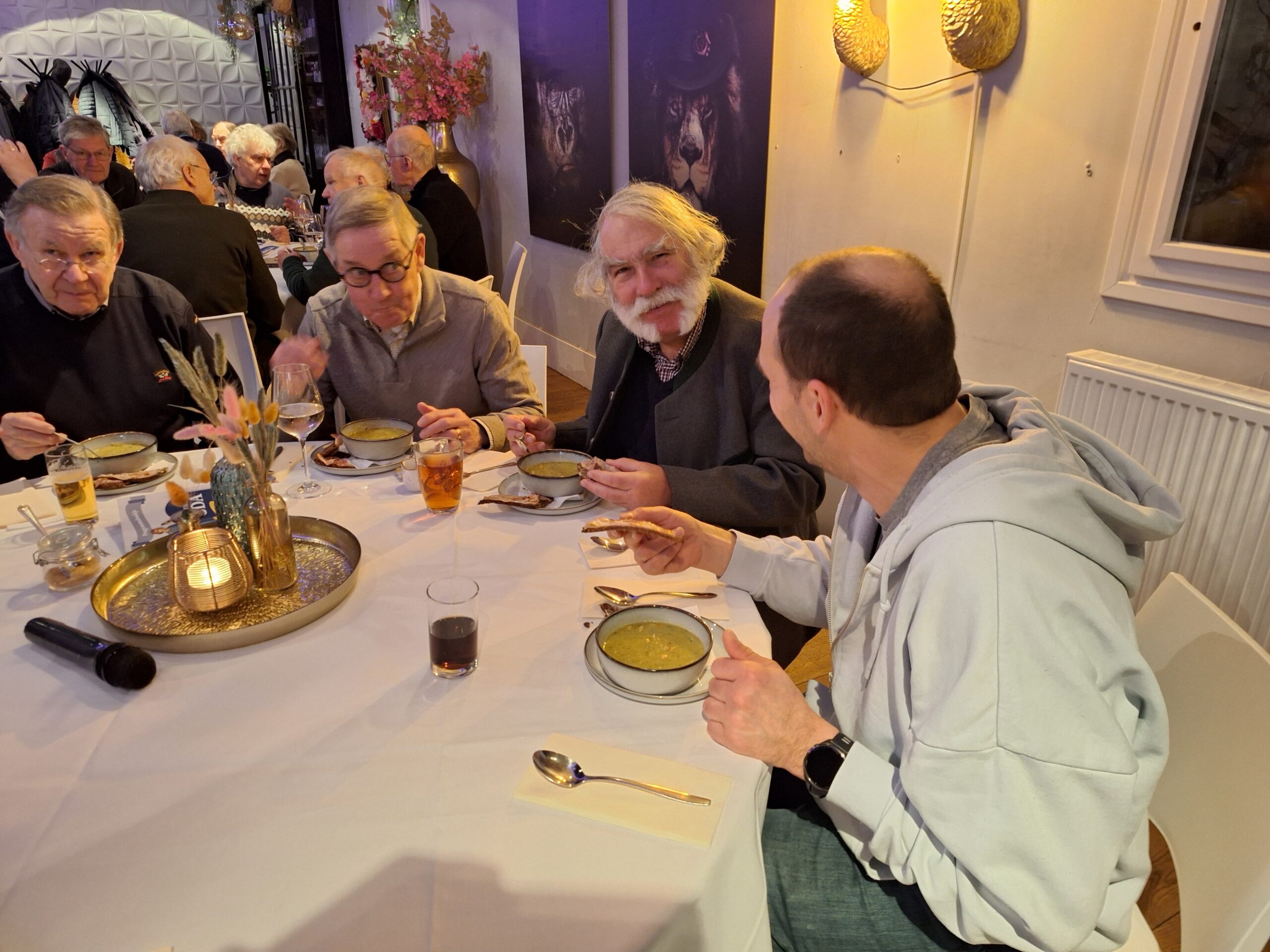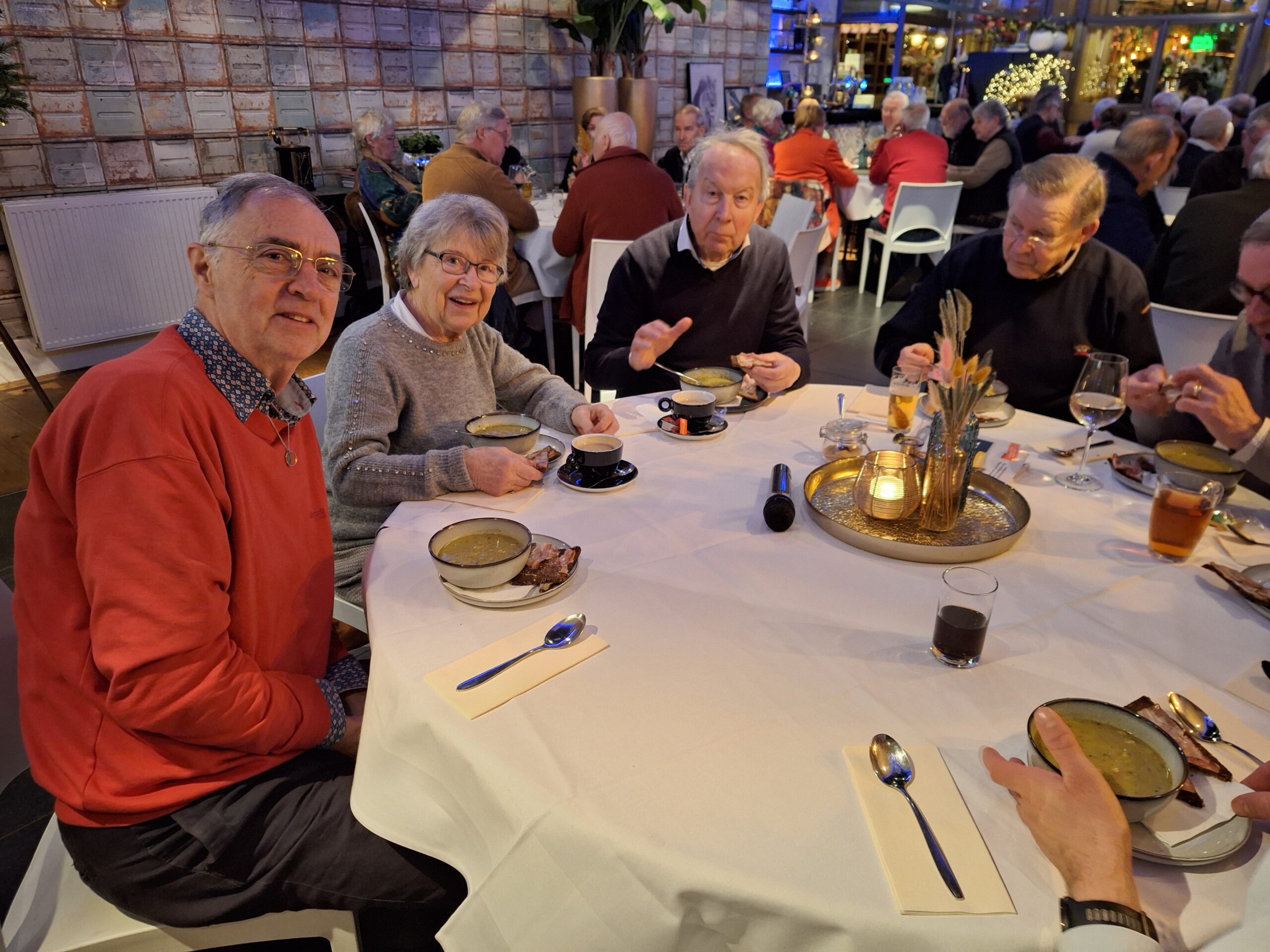 Na de wandeling en het bezoek aan de Martinuskerk waren alle deelnemers genodigd aan de tafels voor de Snert. Onder het gezellig bijpraten over al hetgeen deze middag is toegelicht en bewonderd smaakte de snert best. Daarna was er nog gelegenheid voor een drankje. Om 18:30 uur vertrokken de laatste deelnemers.