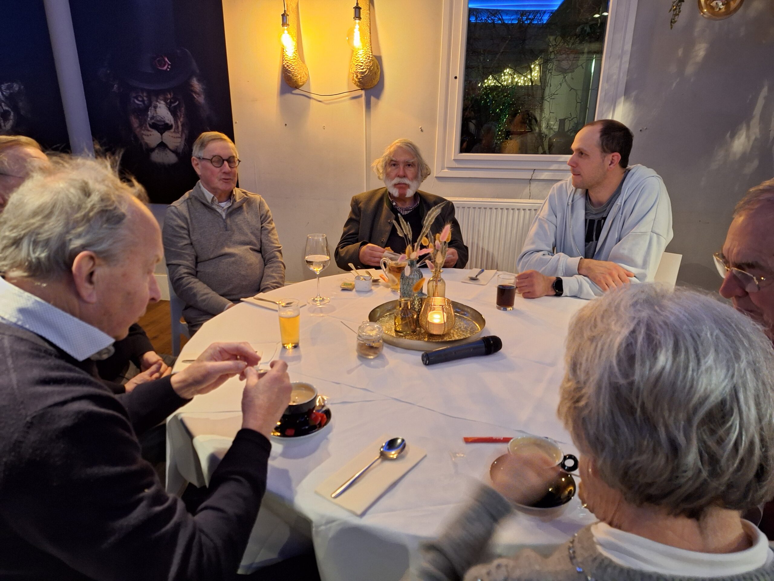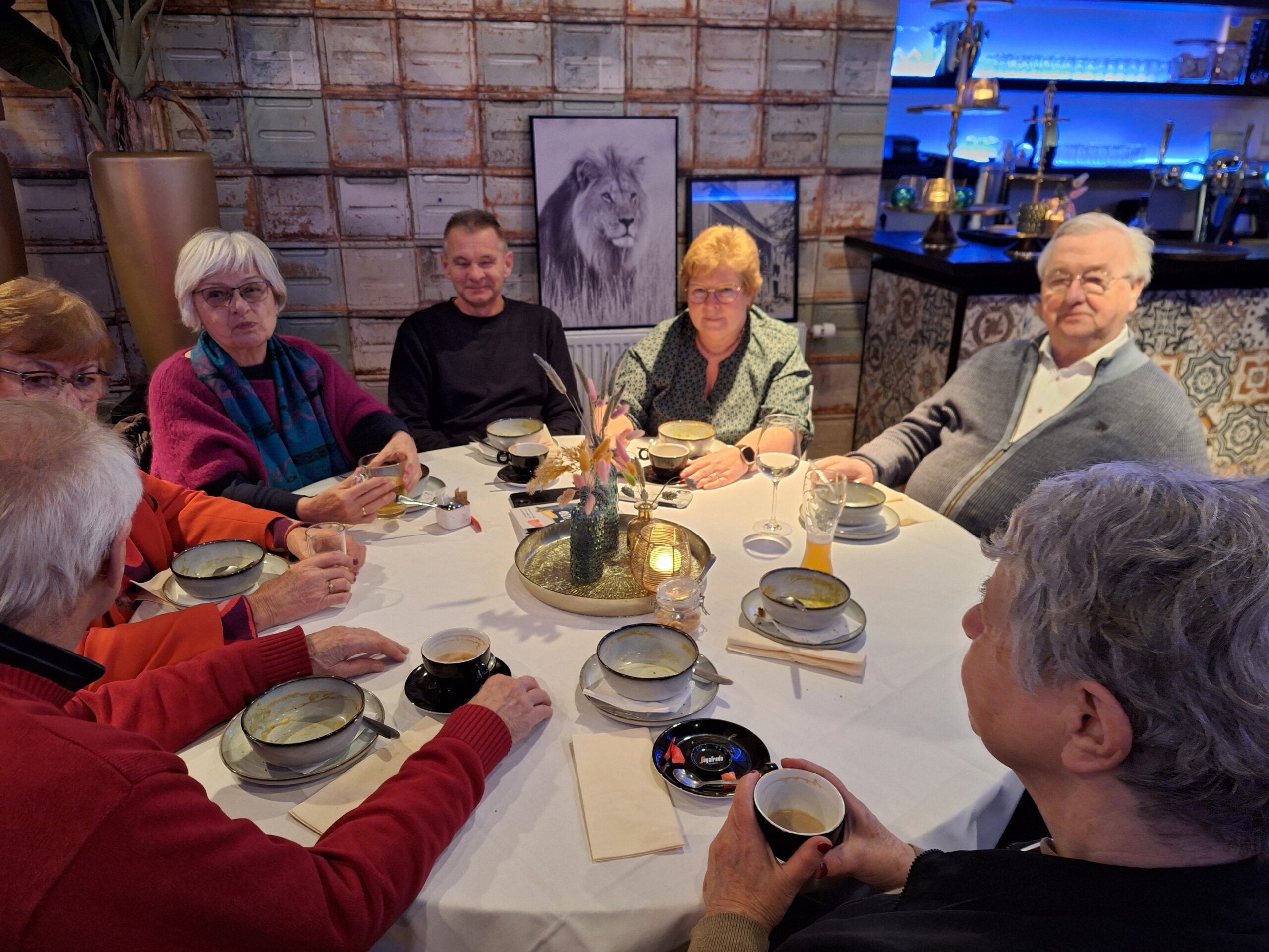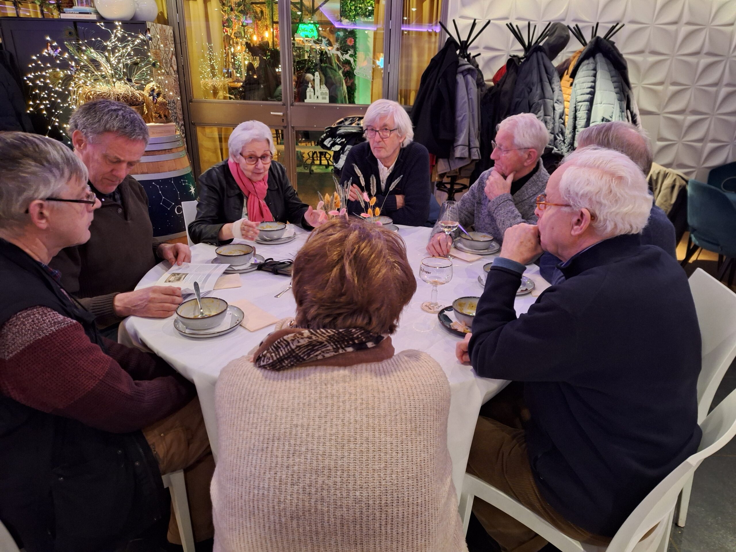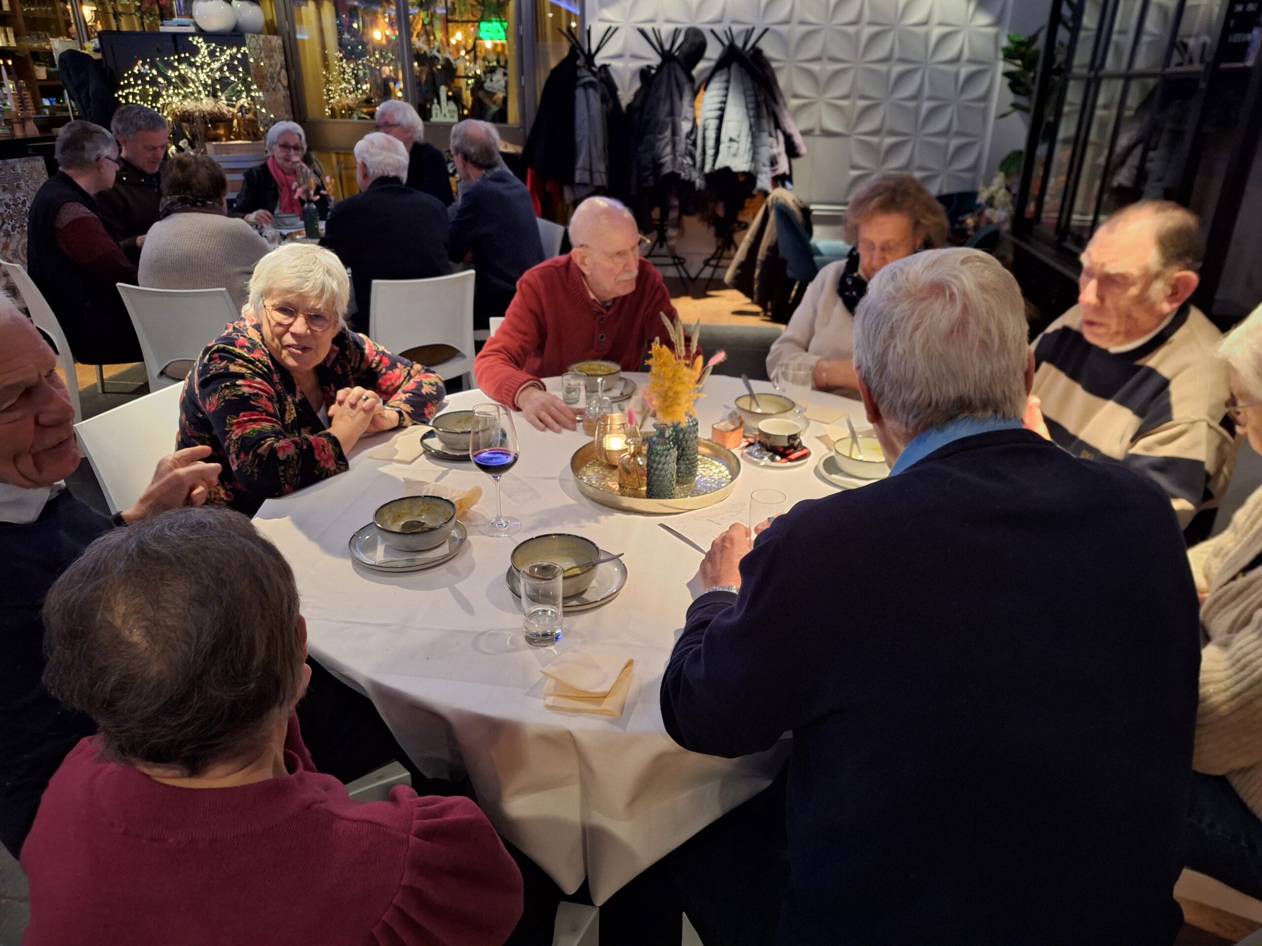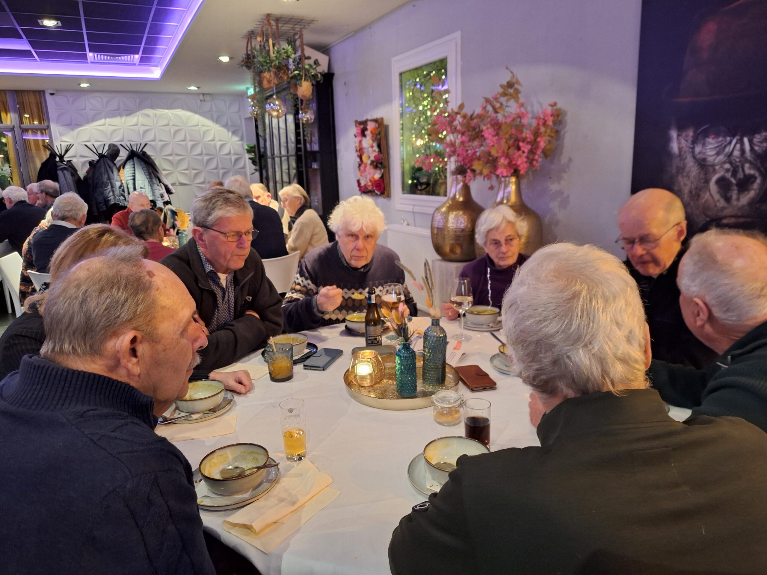 Na de wandeling en het bezoek aan de Martinuskerk waren alle deelnemers genodigd aan de tafels voor de Snert. Onder het gezellig bijpraten over al hetgeen deze middag is toegelicht en bewonderd smaakte de snert best. Daarna was er nog gelegenheid voor een drankje. Om 18:30 uur vertrokken de laatste deelnemers.